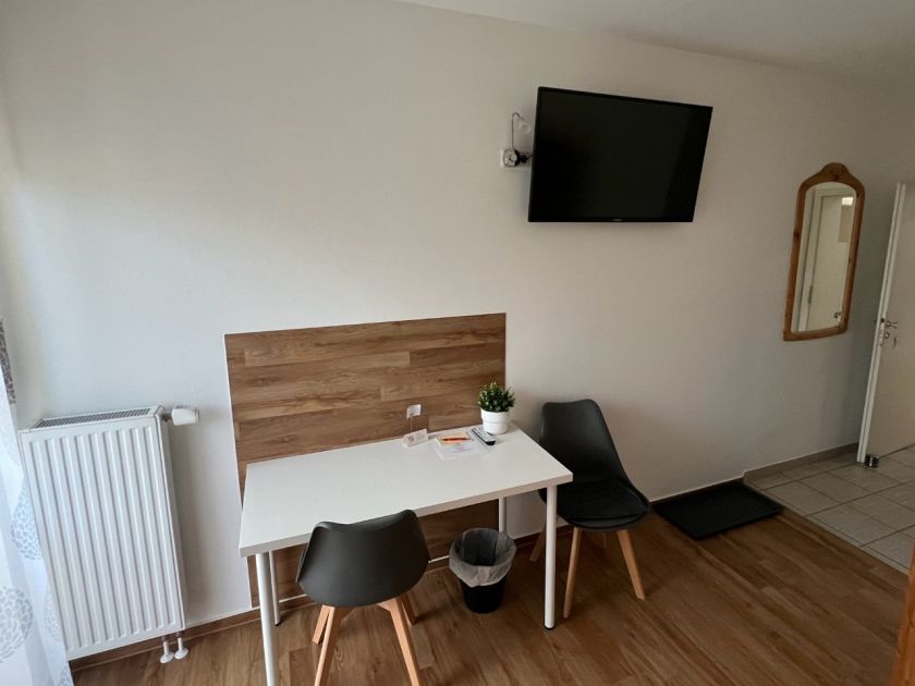 - Bad mit Dusche, WC und Handtuchheizkörper sowie Fön und kostenlose Badartikel (Seife, Shampoo, etc.). Kostenfreies WLAN, Flachbild-TV, SAT-TV, Bett 90x200 cm, Kleiderschrank, Tisch und Stuhl, Zugang zur Terrasse.