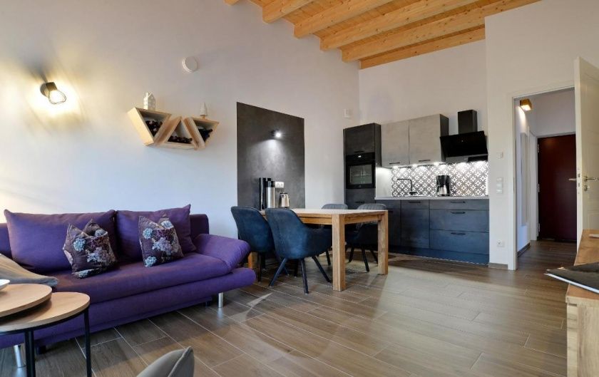 Der Wohnraum beinhaltet neben der offenen Küche ein großes Smart TV mit Soundbar. Die Soundbar ermöglicht es euch auch, eure eigene Musik mittels Bluetooth Verbindung abzuspielen. Ihr habt freien Zugang zu unserem kostenlosen WLAN.