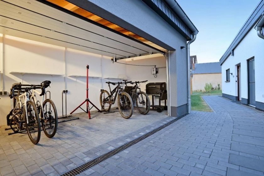 Für eure Räder haben wir eine Garage mit Sektionaltor, 6 Radständern, 6 Steckdosen für die Ladegeräte eurer Pedelecs, eine Standluftpumpe, einen Reparaturständer und etwas Werkzeug. Zudem bieten wir für euch Mountainbiker einen Waschplatz mit Gartenschlauch an. Eure Räder können in der Garage zusätzlich an im Boden eingelassenen Haken gesichert werden. Die Garage misst eine Tiefe von 2,50 Meter. Es können auch Motorräder untergestellt werden.