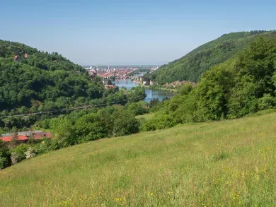 Vom Gipfel aus hast du einen atemberaubenden Blick über das Rheintal, die Stadt Heidelberg und das berühmte Heidelberger Schloss.